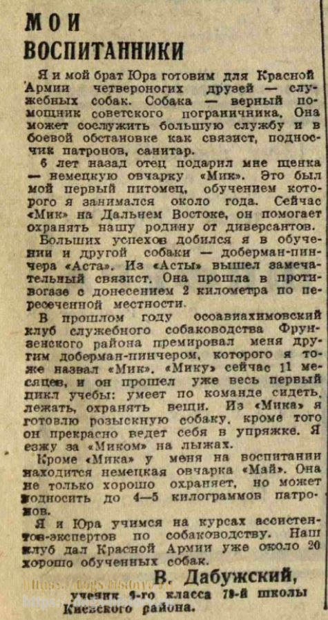 Статья "Мои воспитанники" из газеты "Вечерняя Москва" 22 февраля 1939г.№43 Автор - В.Добужский, ученик 6-го класса 78 школы Киевского района.